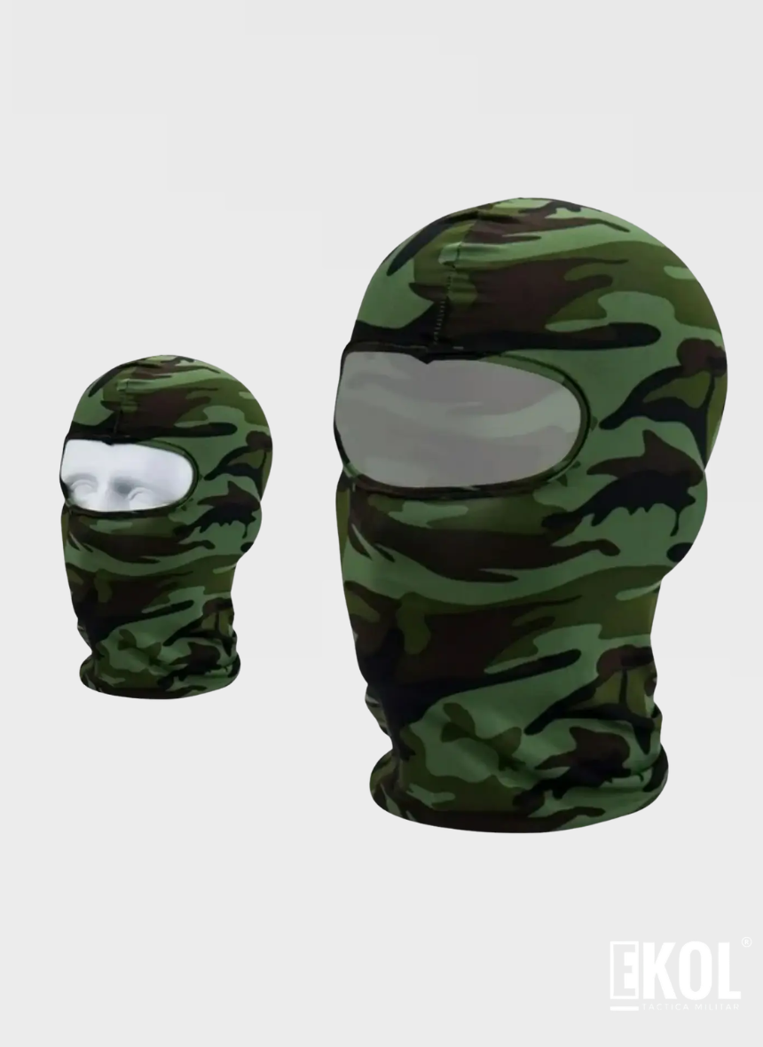 DESCRIPCION: Balaclava Táctica Camuflada – Protección Térmica y TranspirableDescripción General:Esta máscara facial completa ofrece una cobertura integral para la cabeza, el rostro y el cuello, diseñada específicamente para entusiastas del aire libre y profesionales. Fabricada con materiales de alta elasticidad como lycra y spandex, garantiza un ajuste cómodo y firme (talla única) que no pierde su forma con el uso constante.