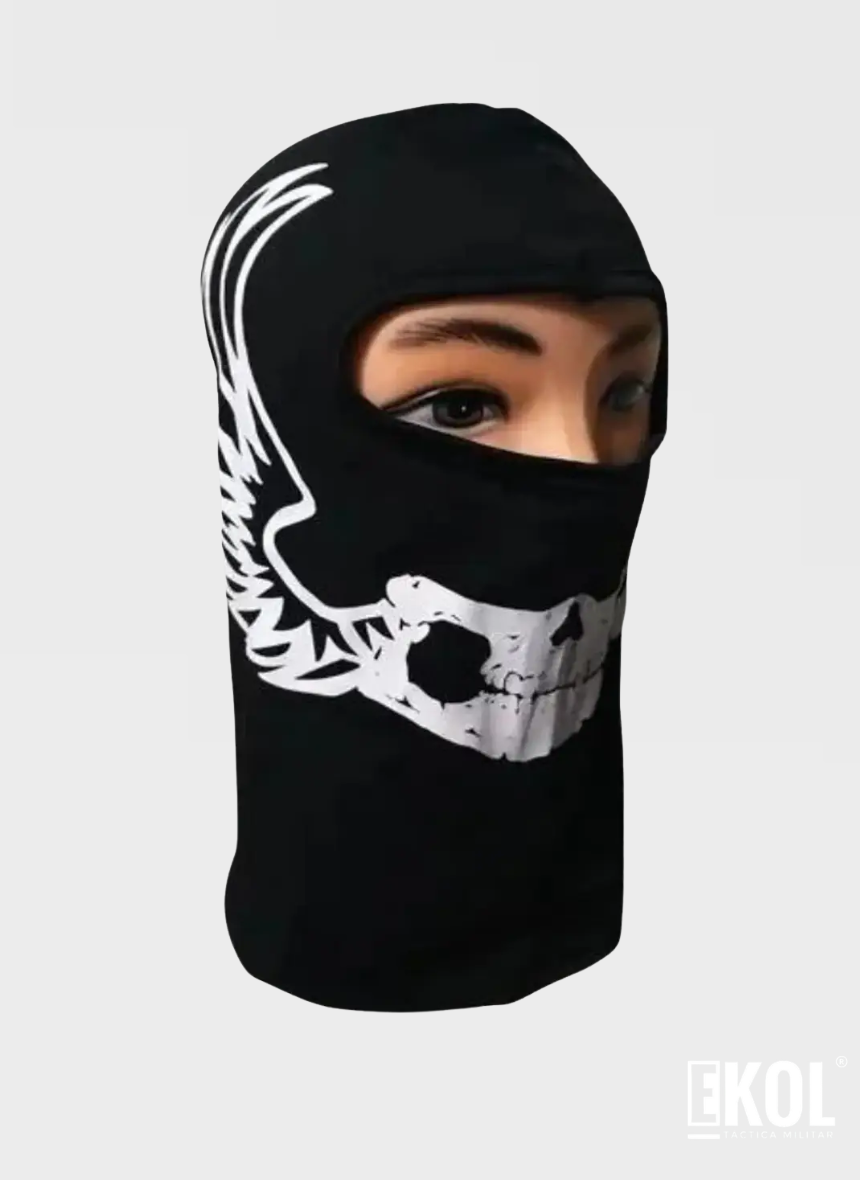El producto en la imagen es una balaclava o pasamontañas de color negro con un diseño estampado blanco de una calavera y alas.