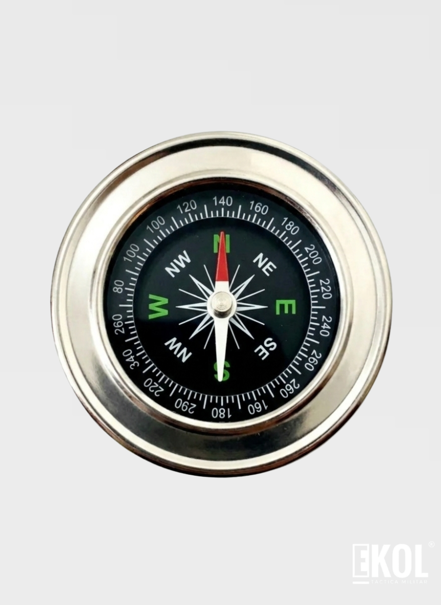 Brújula de mano tipo compás fabricada en acero inoxidable de alta durabilidad para uso rudo. Cuenta con sistema magnético de alta precisión y un diámetro compacto de 5.5 cm. Es una herramienta esencial de orientación para camping, senderismo y supervivencia extrema. Su diseño robusto y escala legible garantizan navegación fiable en cualquier entorno natural. Imagen de portada realizada con IA.