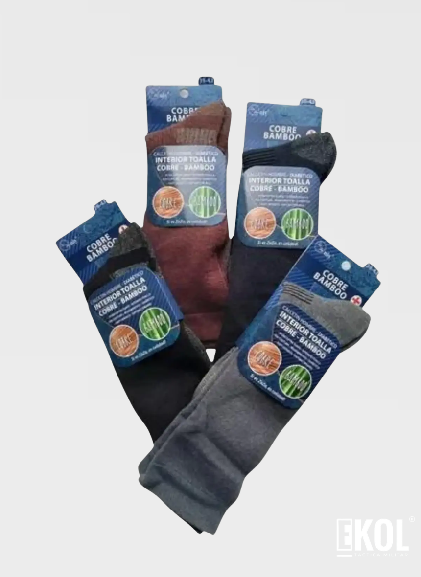 La primera imagen es referencial y fue generada mediante inteligencia artificial. Son calcetines fabricados con una mezcla de fibra de bambú y cobre, conocidos por su suavidad y grosor con interior tipo toalla. Generalmente vienen en packs o docenas con colores surtidos como negro, gris y azul