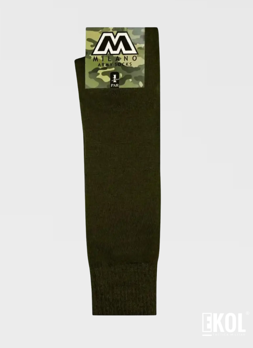 DESCRIPCION: Calcetines Milano Army Socks - Verde Militar Calcetines largos de alta calidad diseñados específicamente para el uso con uniformes institucionales y botas de combate. Su fabricación robusta y color verde musgo estándar los hacen la elección preferida para personal de las fuerzas de orden (como Carabineros) y militares. Características Principales: