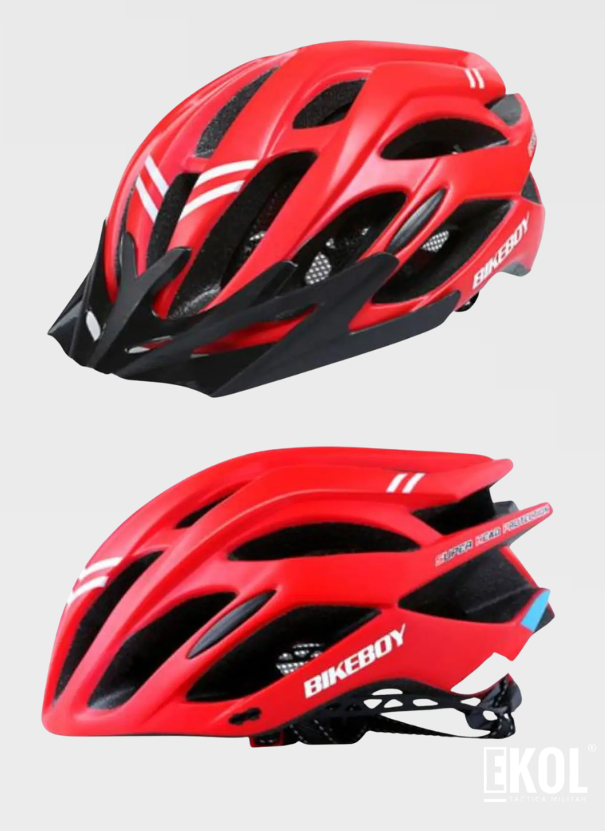 La primera imagen es referencial y fue generada mediante inteligencia artificial.Este casco de ciclismo de la marca BikeBoy presenta una estructura ligera con múltiples aberturas para ventilación y una visera frontal.