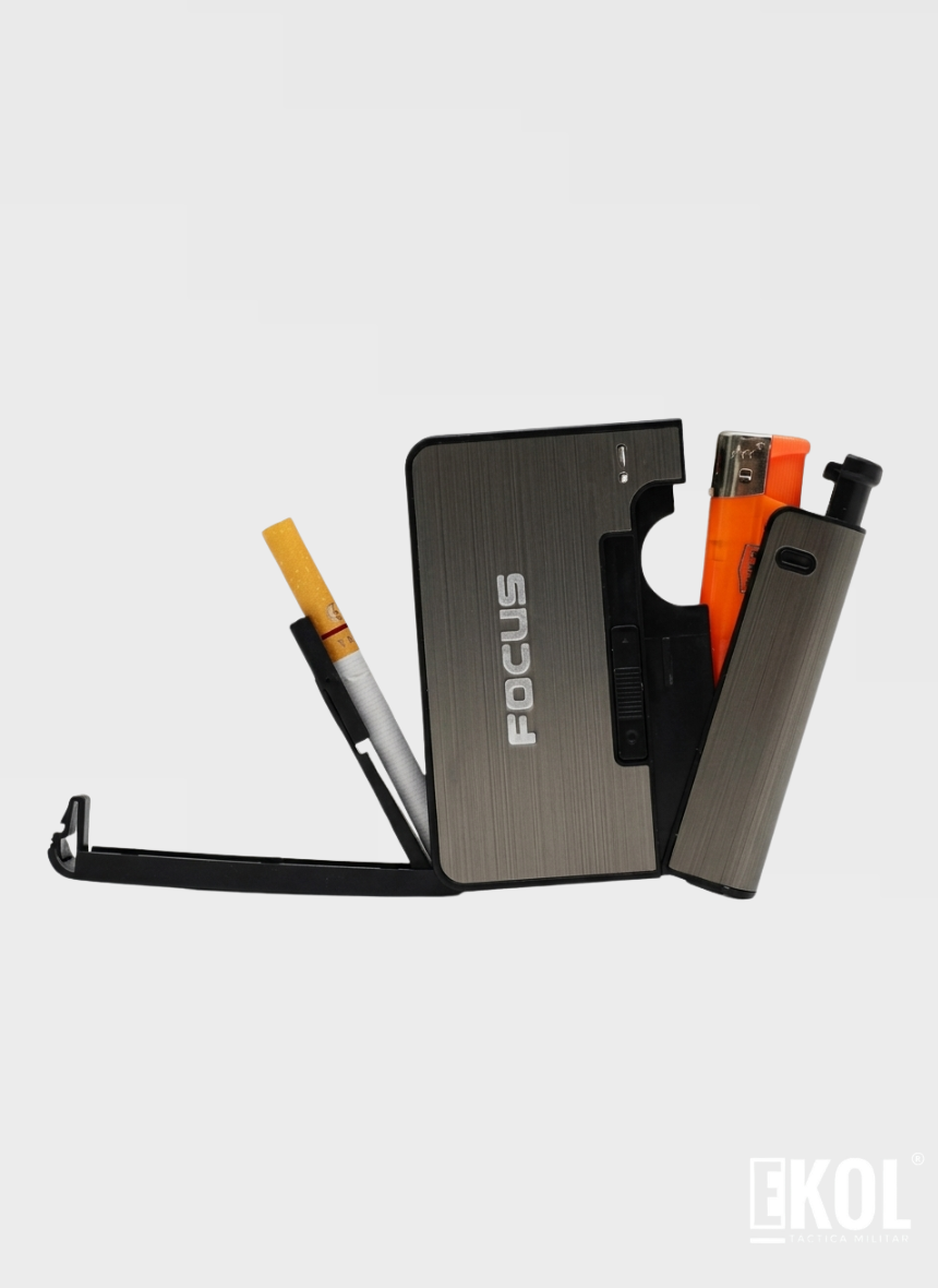 Lleva tus cigarros organizados y protegidos con esta práctica cigarrera metálica Focus, diseñada para dispensar cigarrillos automáticamente, uno por uno, con total comodidad. Incorpora un espacio para integrar un encendedor estándar (no incluido), manteniendo todo lo esencial en un solo accesorio compacto.