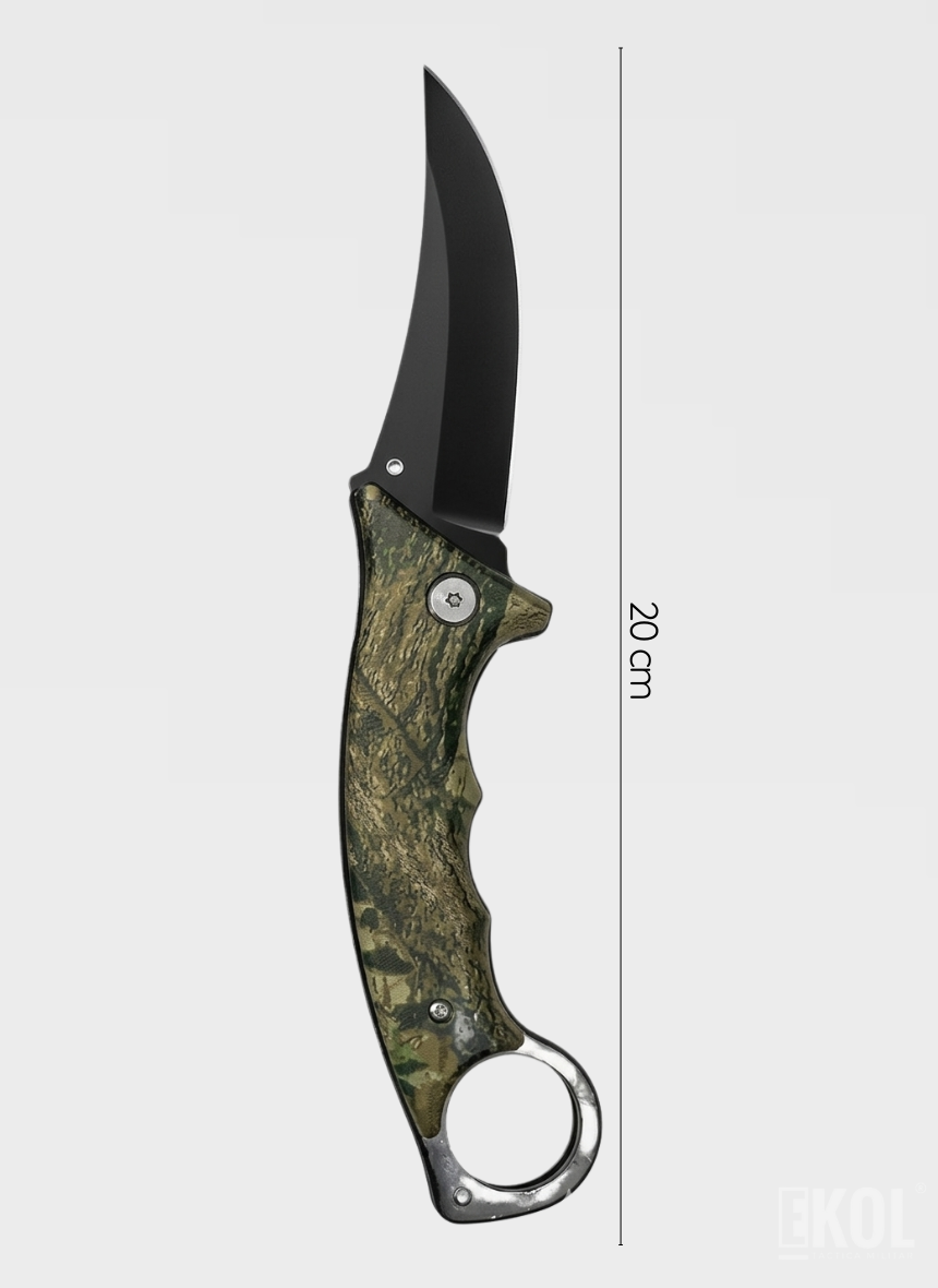 Este cuchillo Karambit de 20 cm combina el diseño tradicional con una construcción robusta, ideal para quienes buscan una herramienta de alto rendimiento en actividades tácticas, de caza o supervivencia. Su hoja curva está diseñada para ofrecer cortes precisos y una maniobrabilidad excepcional en situaciones exigentes.