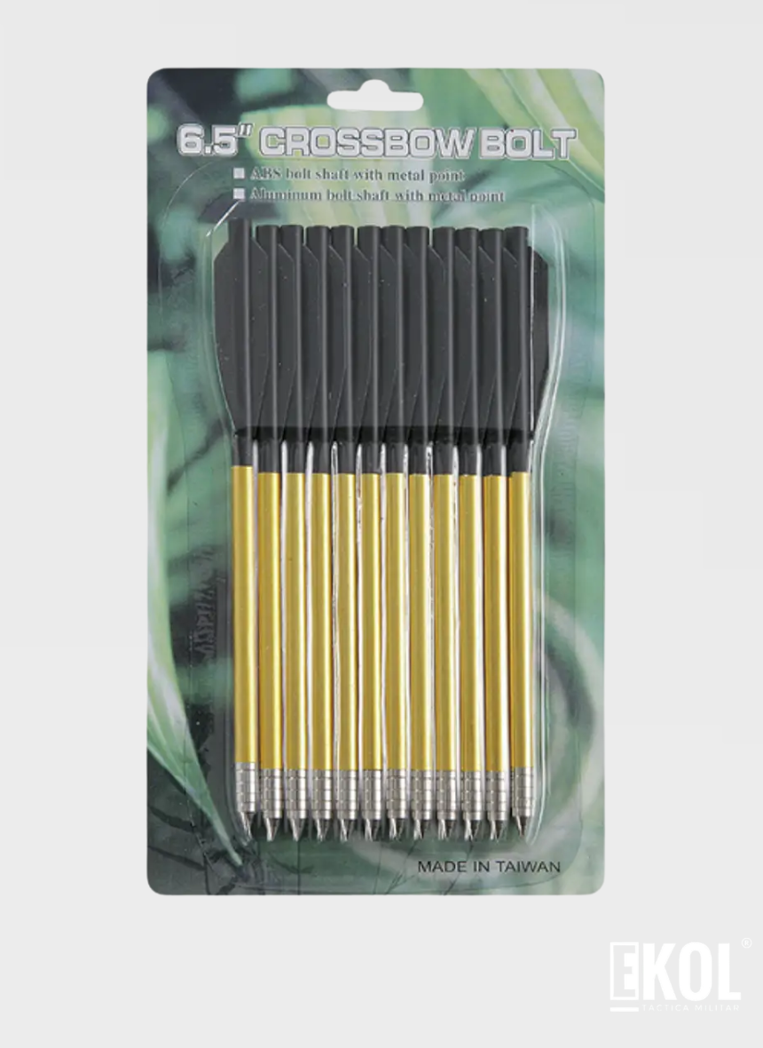 DESCRIPCION: Optimiza tu precisión y potencia con nuestro set de 12 virotes de aluminio de 6.5 pulgadas, diseñados específicamente para ballestas de pistola (mano). Ideales tanto para tiro recreativo como para entrenamiento de precisión. Características Principales: