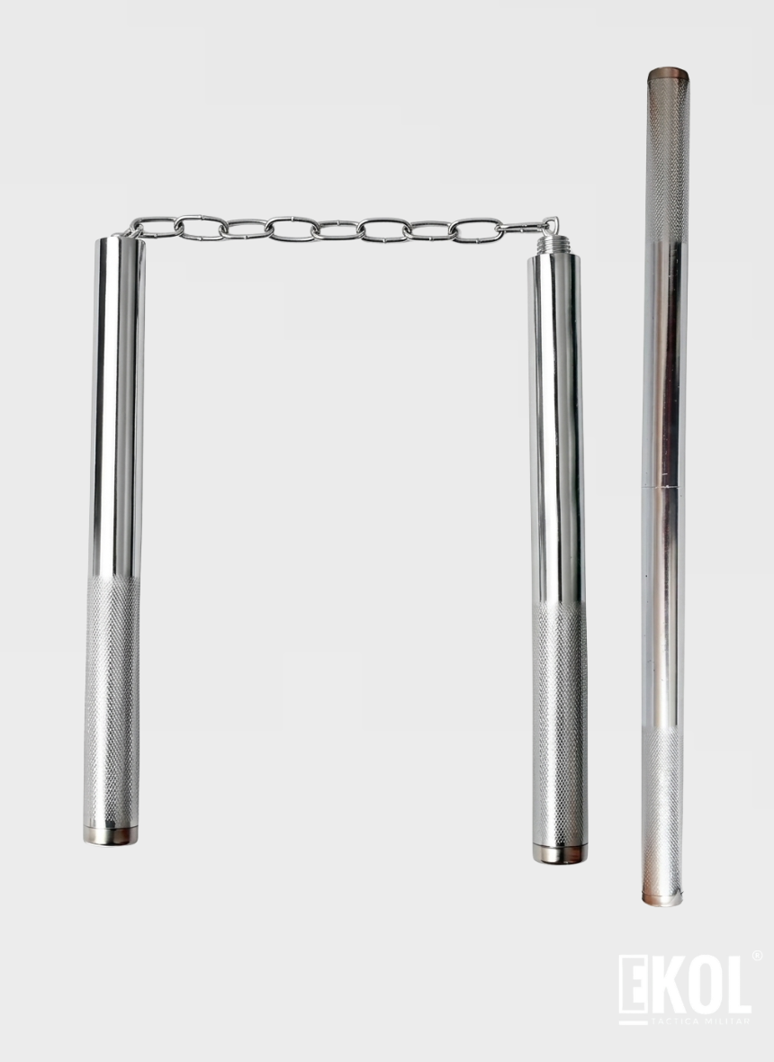 La marca YINGCAI ha desarrollado este equipo utilizando metal de alta resistencia con un acabado plateado pulido que garantiza durabilidad en entornos exigentes. Cada mango posee una longitud individual de 28.5 cm, mientras que la cadena de extensión alcanza los 18 cm para permitir una movilidad fluida en técnicas de combate. El diseño integra una zona con textura moleteada diseñada específicamente para asegurar una sujeción firme y evitar cualquier tipo de deslizamiento accidental durante su uso intensivo. Su innovador mecanismo de transformación se basa en un sistema de rosca interna de alta precisión, lo que permite acoplar ambos mangos de manera sólida y almacenar la cadena de forma segura en su interior. Esta funcionalidad permite que el equipo transicione rápidamente de un nunchaku profesional a un bastón corto compacto y discreto.