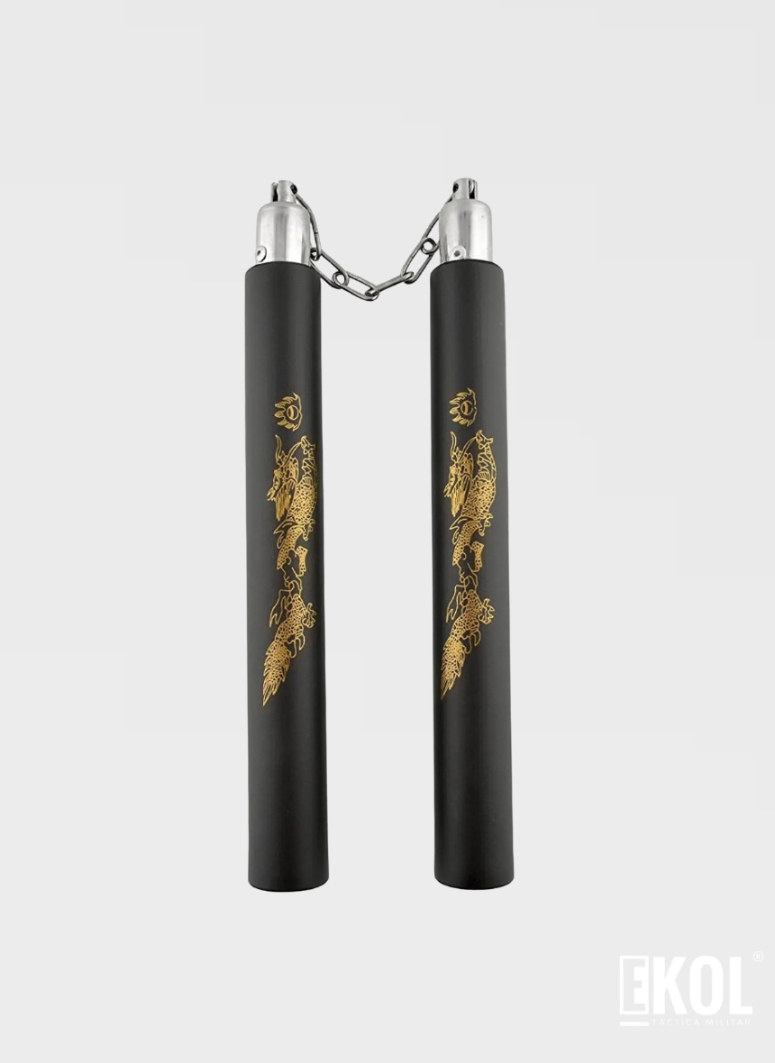 Sus dimensiones han sido cuidadosamente equilibradas para maximizar la maniobrabilidad: cada mango mide 80 centímetros con un diámetro estándar profesional, mientras que la cadena de metal de 26 centímetros proporciona el rango de movimiento ideal para giros, bloqueos y ataques. Con un peso de 200 gramos, ofrece el balance perfecto entre velocidad y contundencia sin comprometer la resistencia.