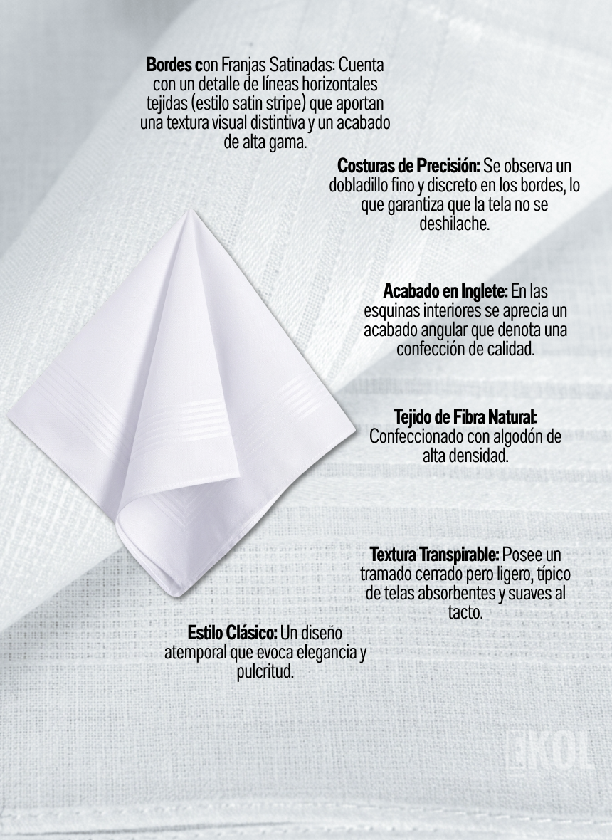 Este pañuelo es una opción elegante y funcional para cualquier ocasión. Su diseño en blanco puro permite personalización o uso clásico, brindando un toque de distinción y utilidad.