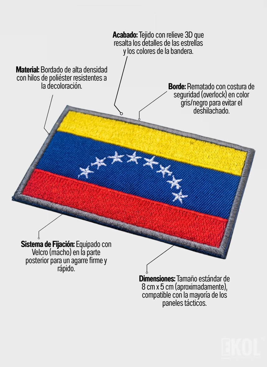 La primera imagen es referencial y fue generada mediante inteligencia artificial. Este parche de la bandera de Venezuela está diseñado específicamente para resistir las condiciones más exigentes, ya sea en el campo de Airsoft, actividades de Paintball o uso Militar/Policial.