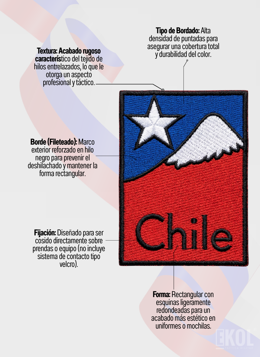 La primera imagen es referencial y fue generada mediante inteligencia artificial. Dale un toque de identidad y distinción a tu equipamiento con este parche de alta calidad. Un diseño único que fusiona nuestra Bandera Nacional con la imponente silueta de la Cordillera, ideal para quienes buscan representar a Chile con orgullo en cualquier aventura.