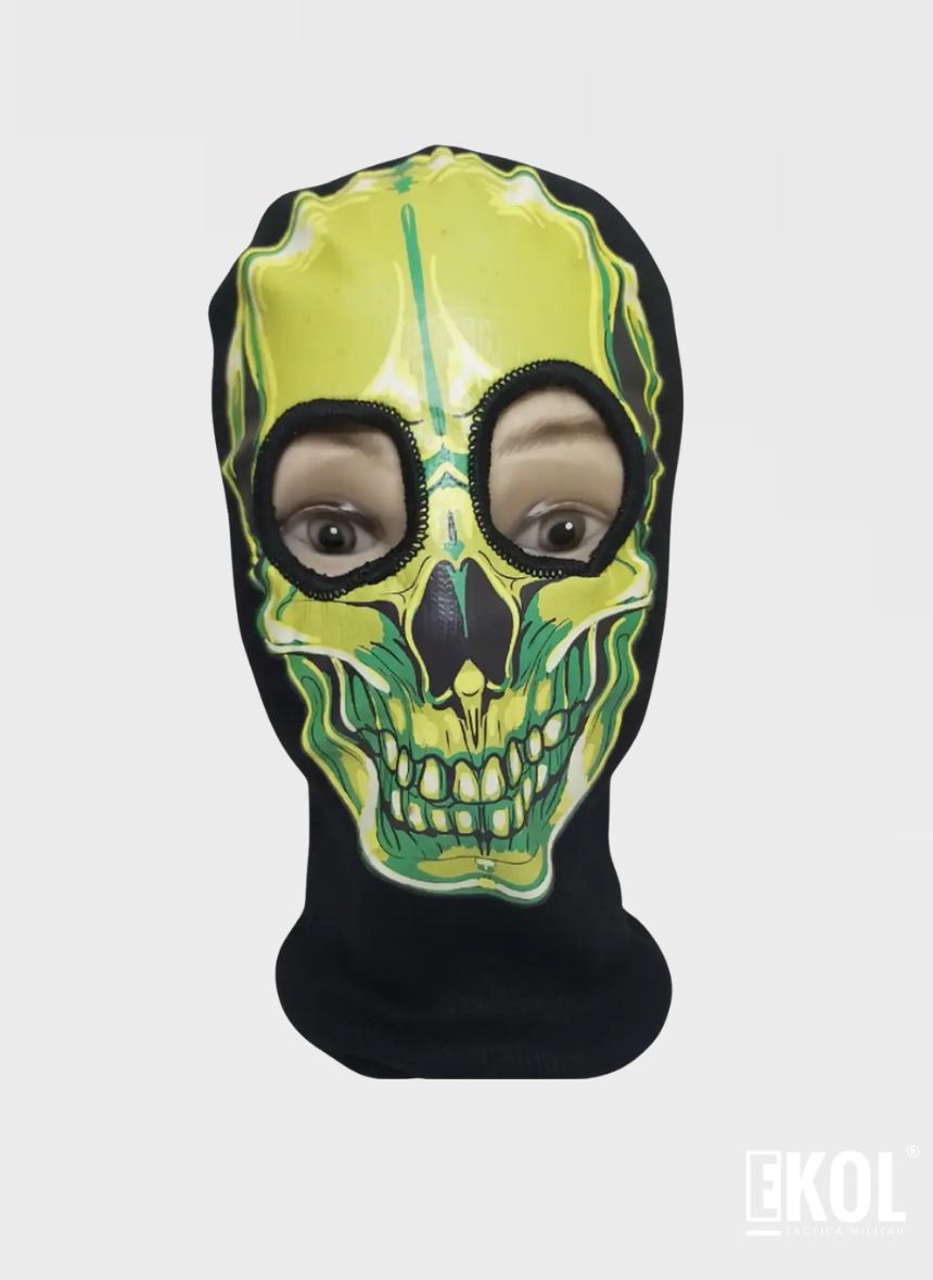 DESCRIPCION: Lleva tu equipamiento al siguiente nivel con este pasamontañas de diseño impactante. Ideal para quienes buscan destacar mientras se protegen de los elementos, este accesorio combina una estética agresiva de calavera en verde neón con materiales de alto rendimiento.Características Principales: